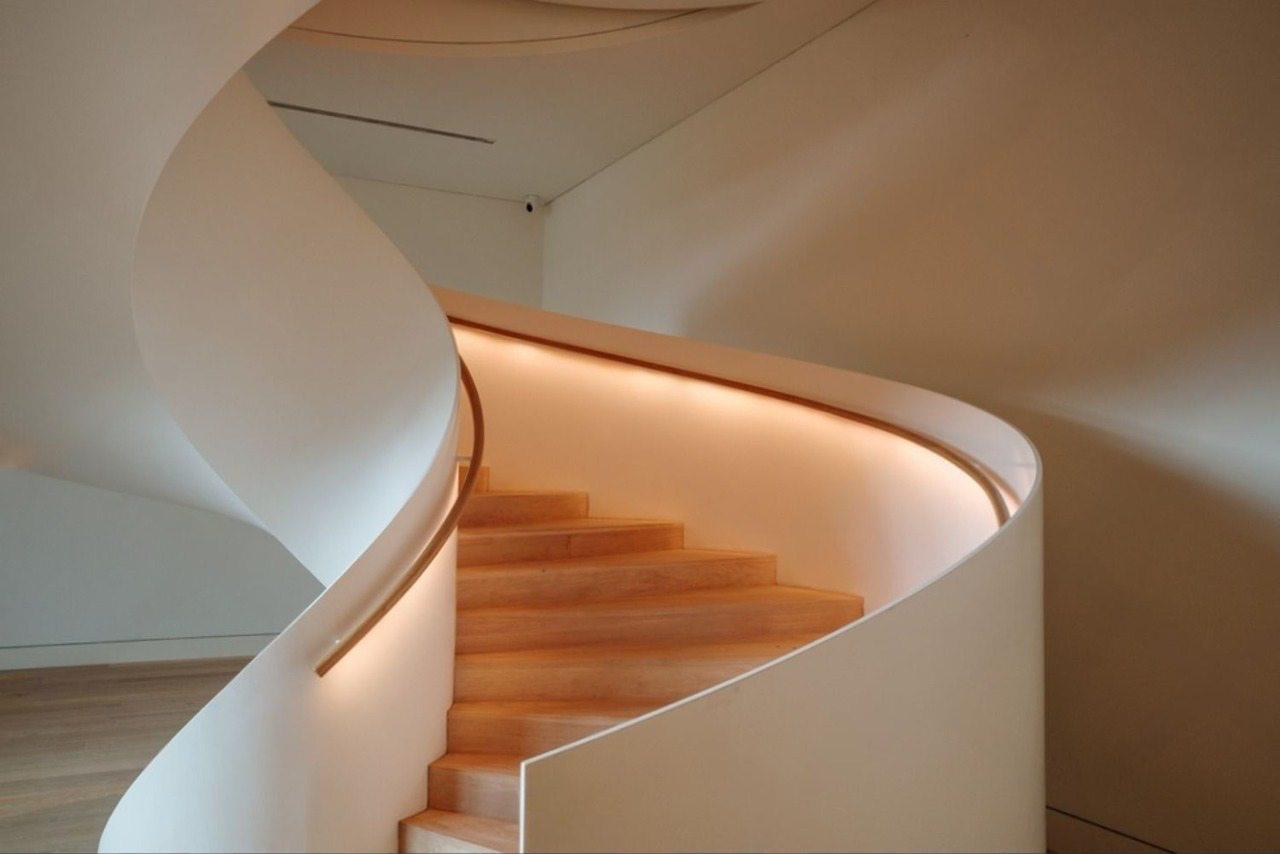 Идея для вашей лестницы: Чтобы акцентировать чистую геометрию лестницы, предусмотрите в стене вдоль лестничного марша несколько точечных светильников на низкой высоте. Направленный свет деликатно очертит контуры ступеней, обеспечит безопасность в темное время суток, и создаст стильный световой эффект.